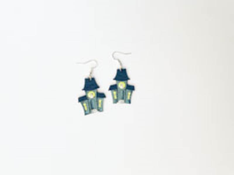 Hergestellt, um die Essenz von Halloween einzufangen, zeigen diese Ohrringe aufwendig gestaltete Spukhäuser, handbemalt mit vielen Details. Die Fenster sind in Neongelb lackiert, das unter UV-Licht leuchtet.