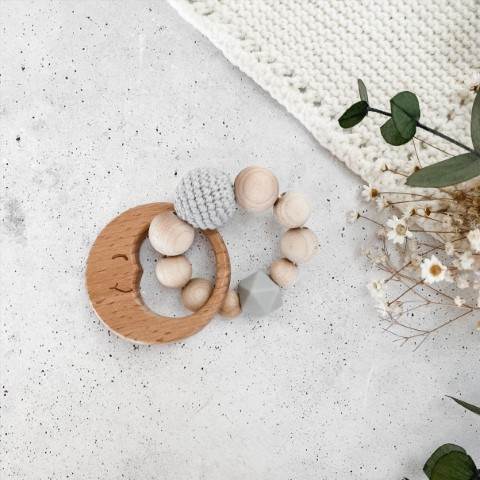 Die verschiedene Haptik von Holzperlen, Anhänger, Silikonperle und Häkelperle laden zum Erkunden ein.