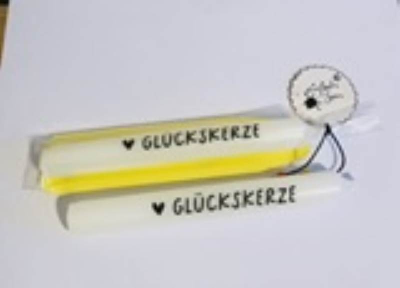 Stabkerze in der Farbe weiß mit dem Motiv "Glückskerze" auf einem gelben Hintergrund. In Cellophan verpackt, mit einem schwarzen Baumwollfaden mit bunten Holzkugel geschlossen
